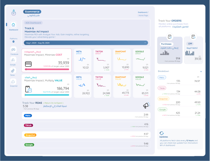 صفحة واحدة تراقب فيها حملاتك الرقمية في جميع المنصات، المصروفات 💰، المبيعات القادمة من إعلاناتك 📈، نسبة العائد على الإعلان 📊، تكلفة عملية البيع الواحدة 💵